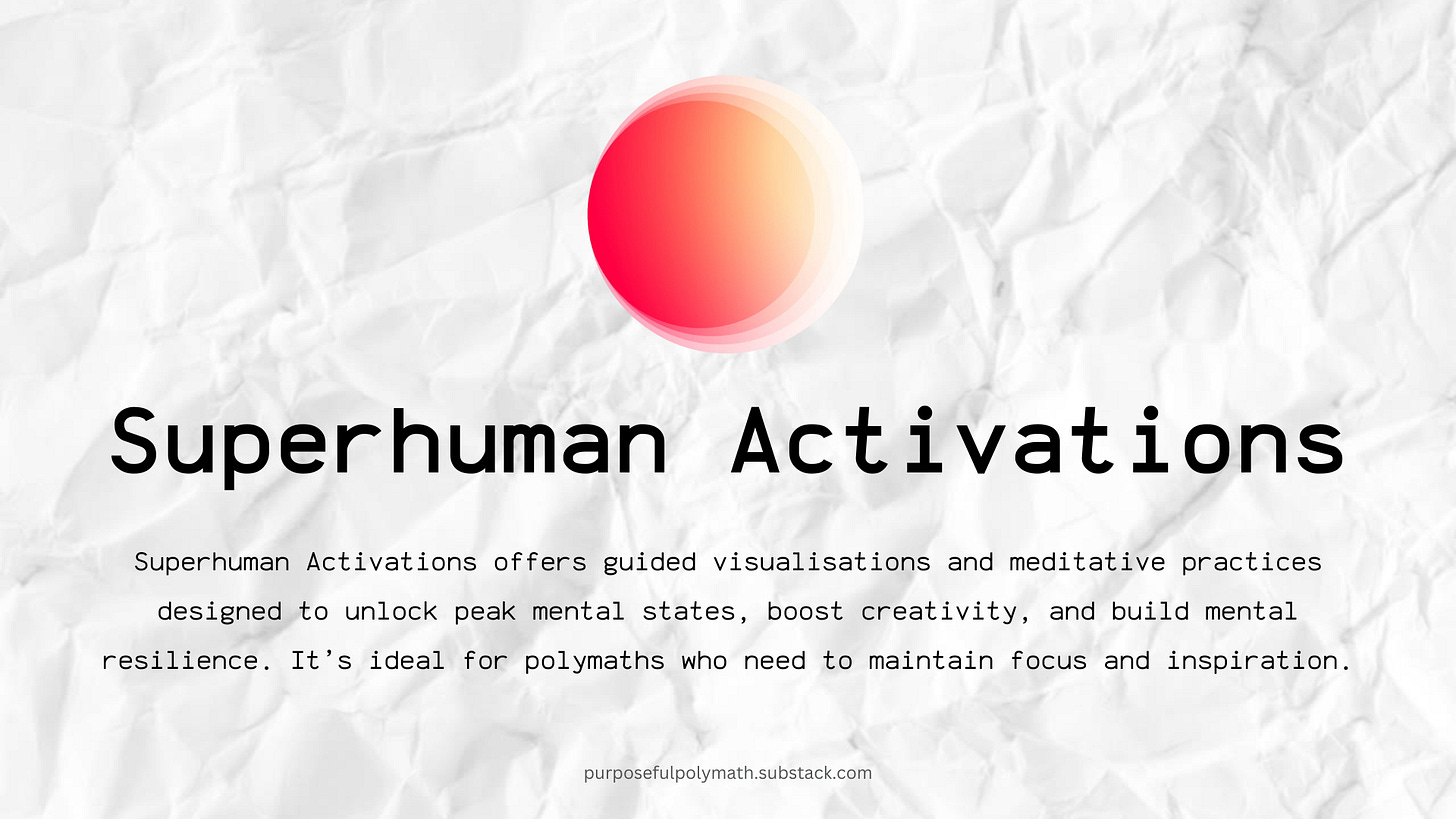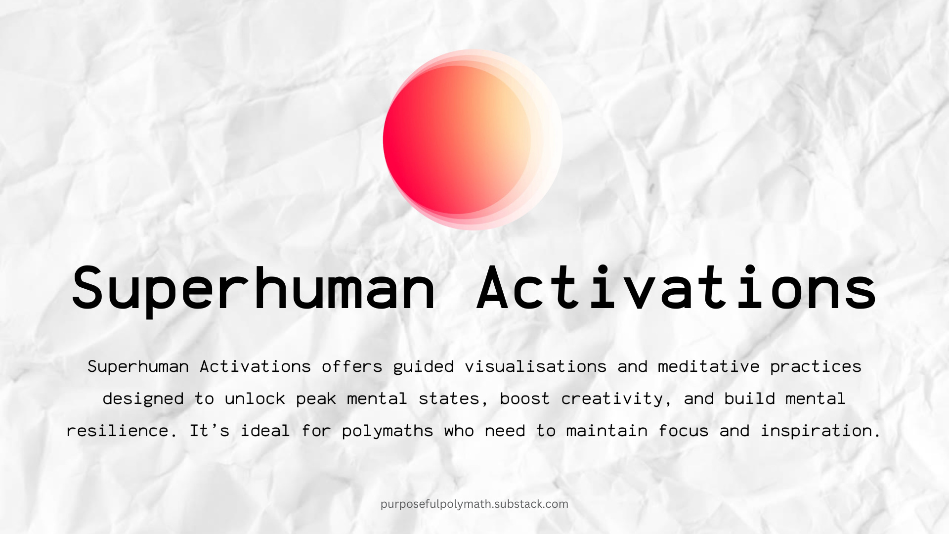 Superhuman Activations offers guided visualisations and meditative practices designed to unlock peak mental states, boost creativity, and build mental resilience. It’s ideal for polymaths who need to maintain focus and inspiration.