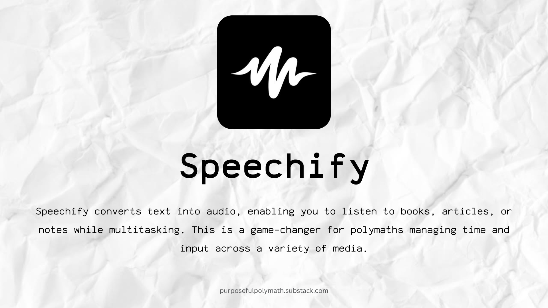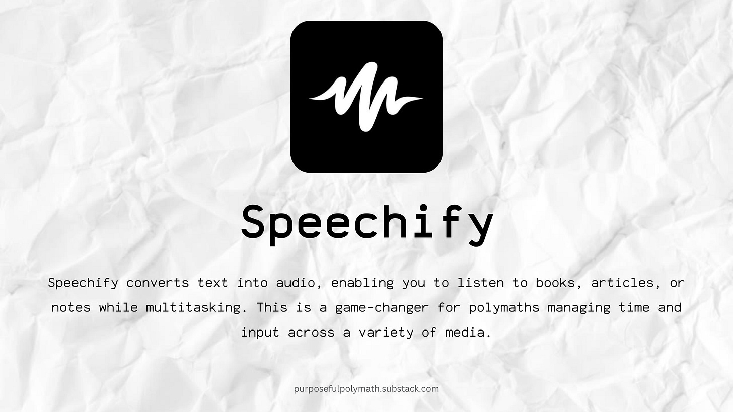 Speechify converts text into audio, enabling you to listen to books, articles, or notes while multitasking. This is a game-changer for polymaths managing time and input across a variety of media.