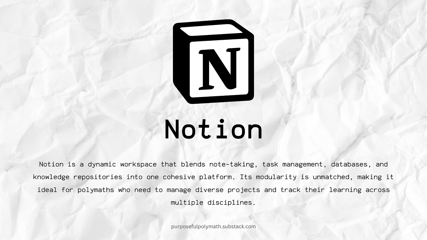 Notion is a dynamic workspace that blends note-taking, task management, databases, and knowledge repositories into one cohesive platform. Its modularity is unmatched, making it ideal for polymaths who need to manage diverse projects and track their learning across multiple disciplines.